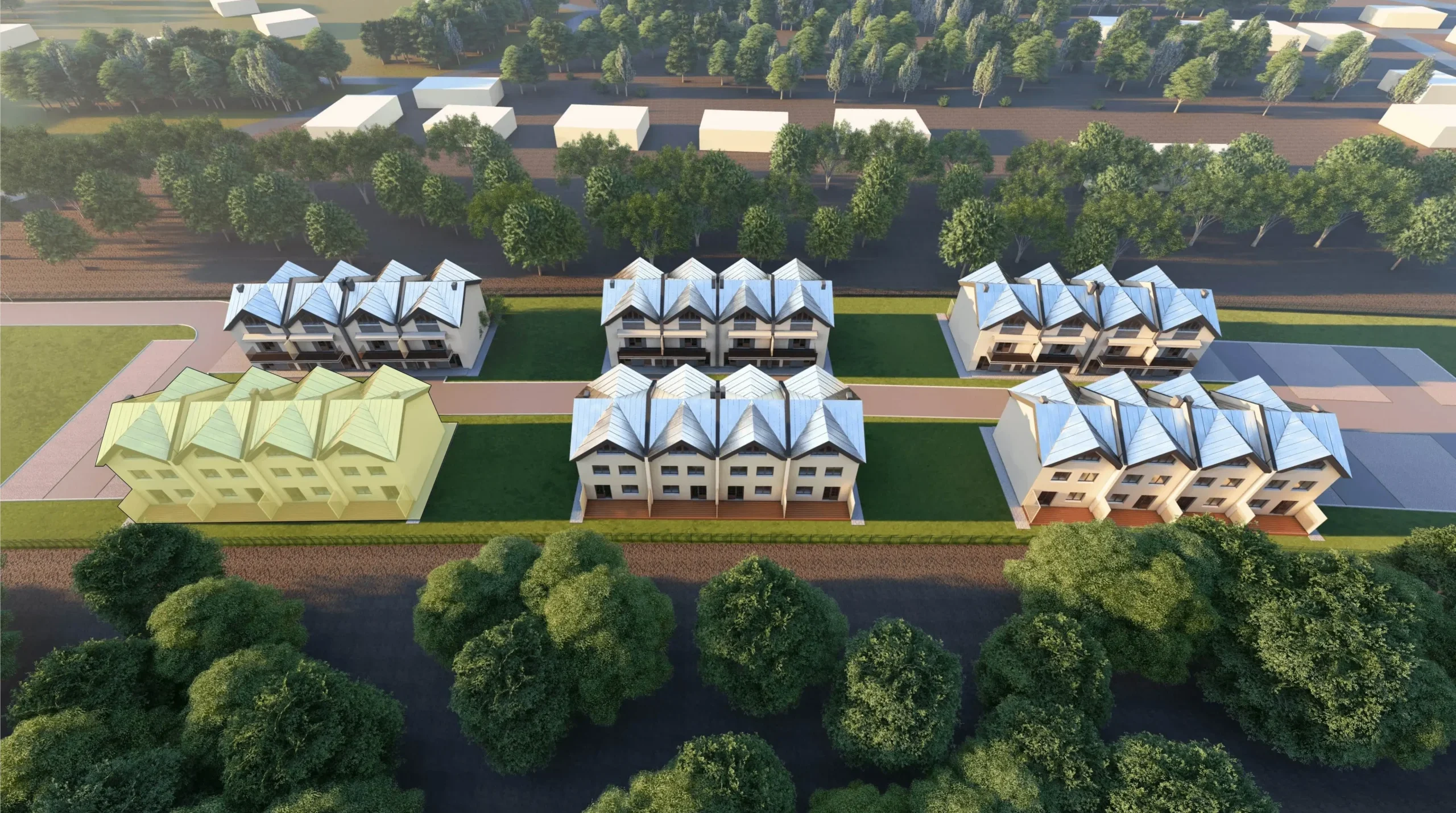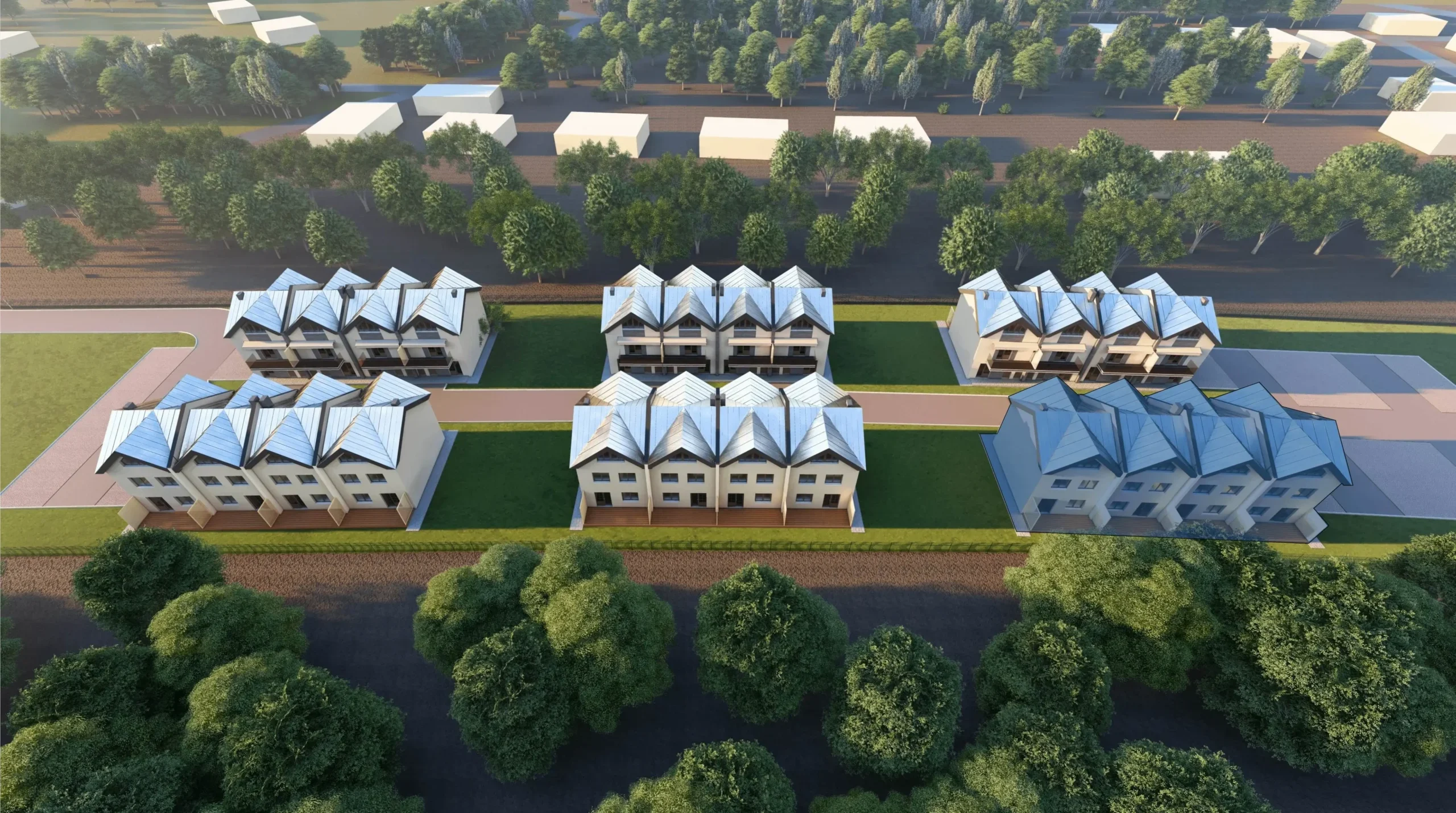 Każdy kotedż jest zaprojektowany jako budynek wielorodzinny i mieści 4 lub 8 oddzielnych mieszkań